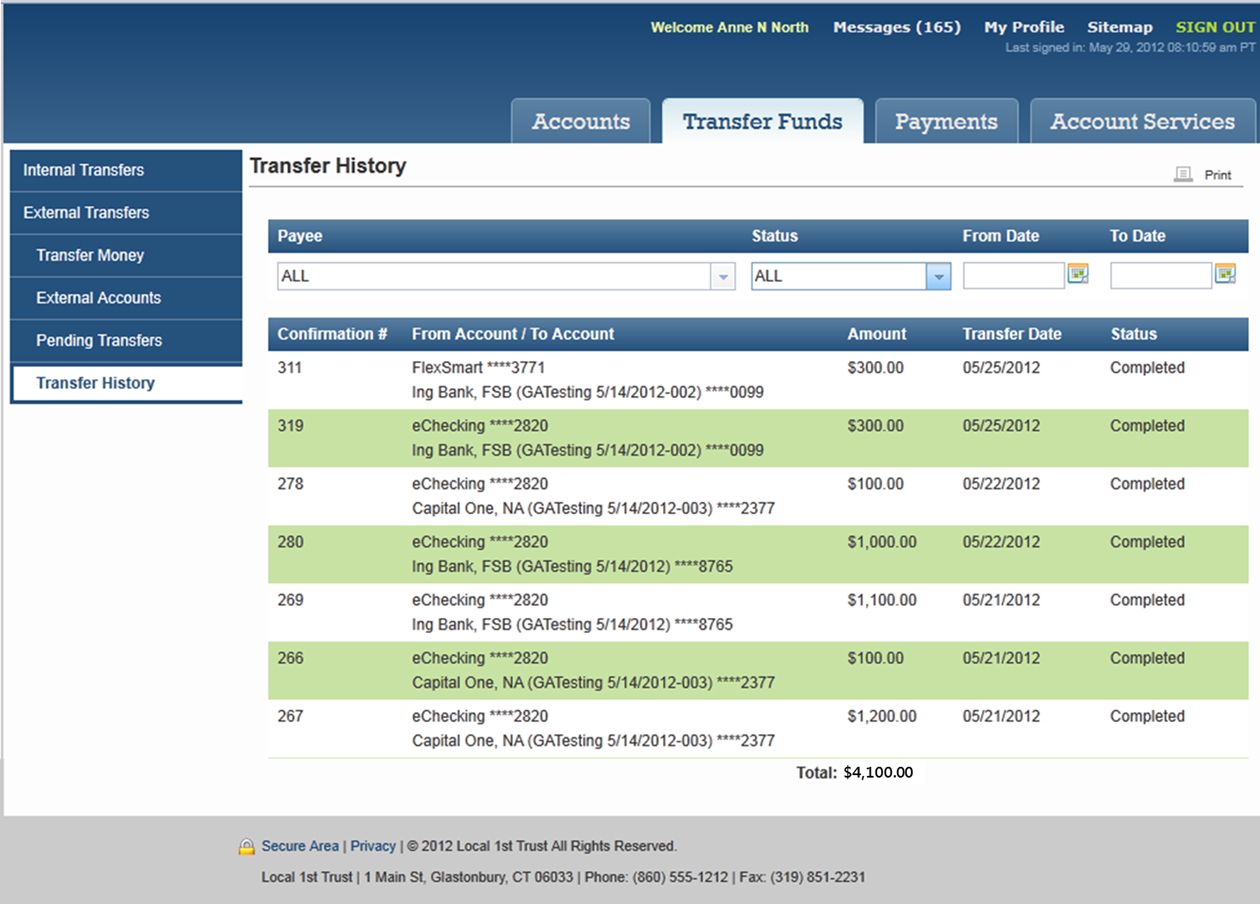 This function displays summary data for external transfers after processing is completed for each transfer. Click the Transfer History link under External Transfers to request the Transfer History page illustrated below.